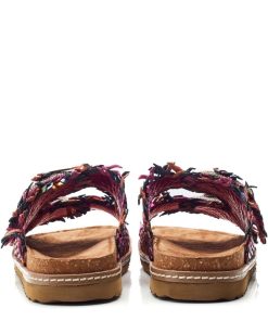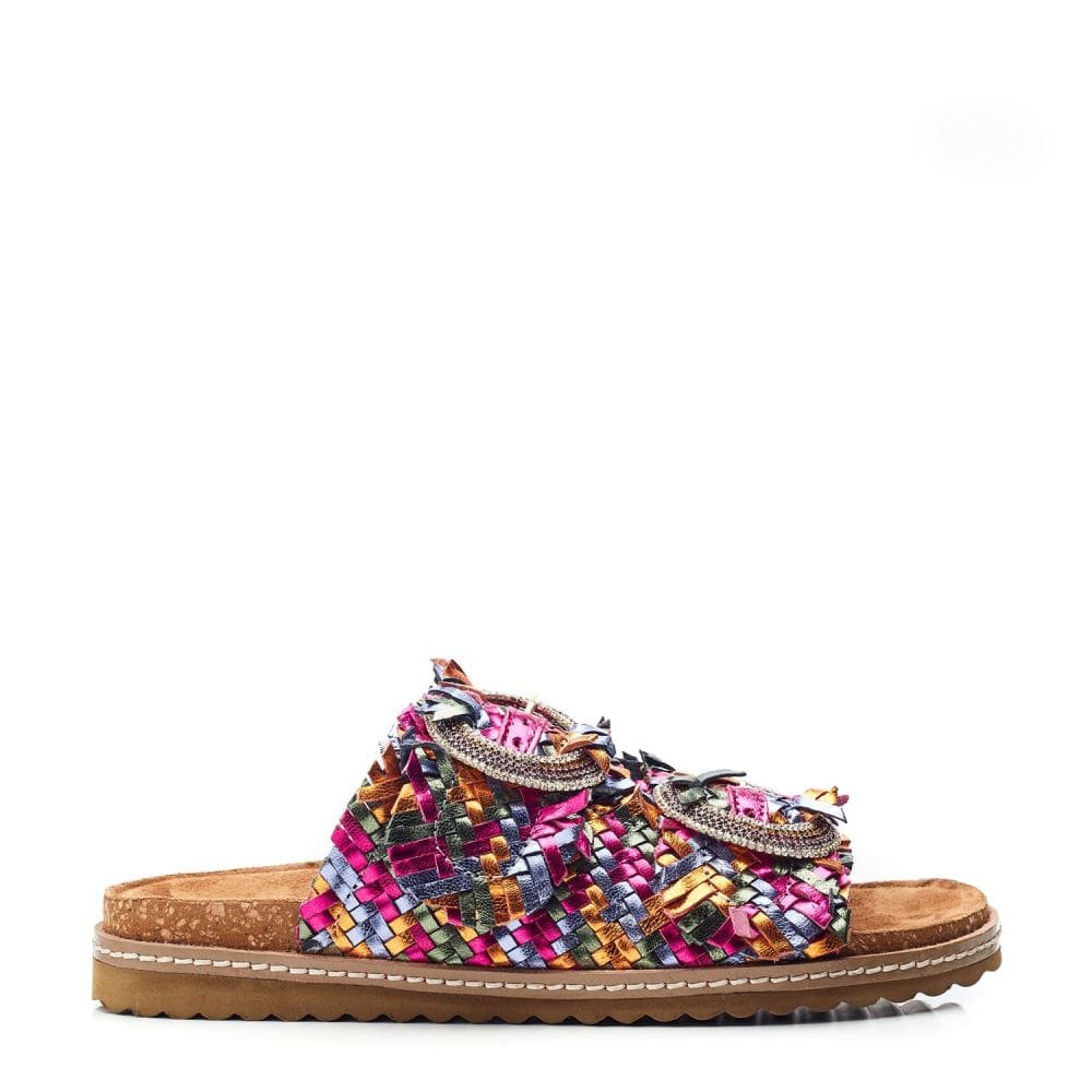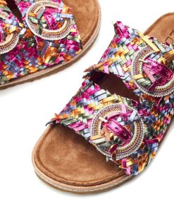 Radiate opulence in Olisia. This slip-on sandal features a metallic woven leather design with glitz buckle embellishments. Made with traditional Spanish workmanship, this artisan-style includes a soft suede footbed for ultimate comfort.