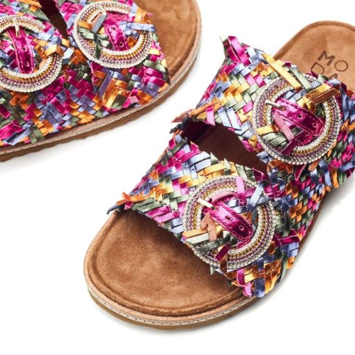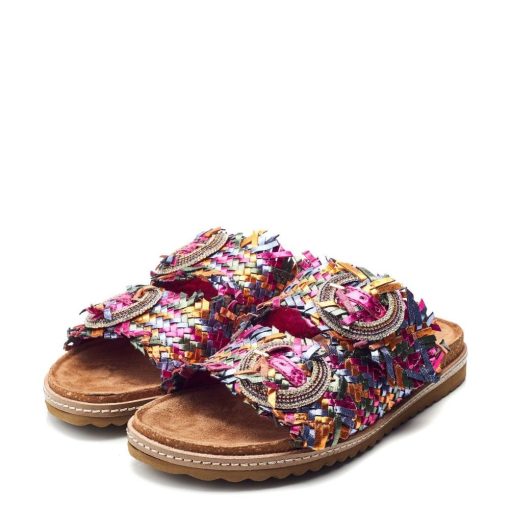 Radiate opulence in Olisia. This slip-on sandal features a metallic woven leather design with glitz buckle embellishments. Made with traditional Spanish workmanship, this artisan-style includes a soft suede footbed for ultimate comfort.